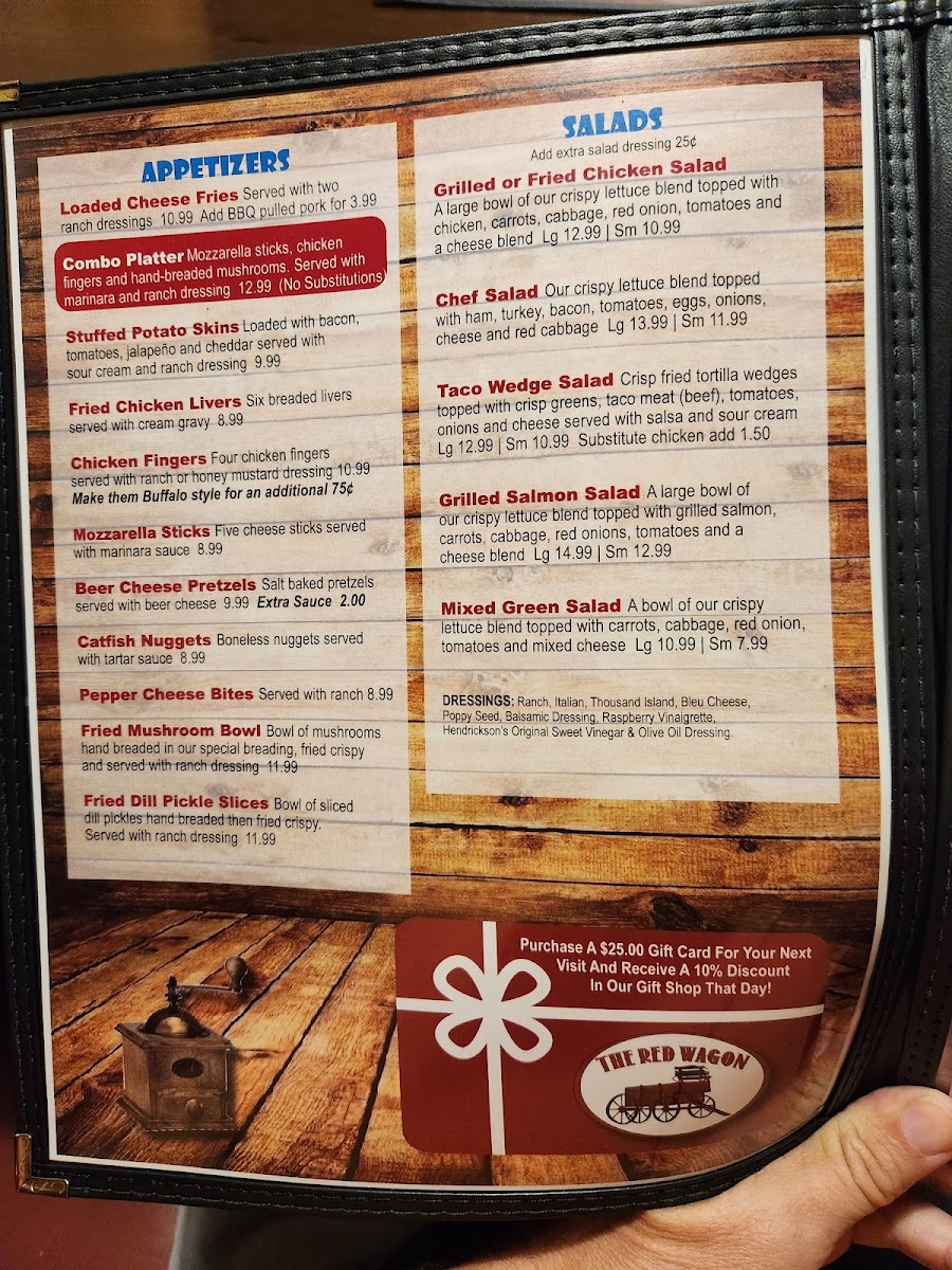 The restaurant also takes pride in its pasta and Cajun entrees, with the Homemade Lasagna and Red Wagon Cajun Chicken & Veggie Pasta Alfredo both standing out as flavorful options. Reviews rave about the warm ambiance and attentive service, with guests noting that each meal feels like a homecooked treat. Whether stopping for a quick bite or a family dinner, The Red Wagon proves to be a must-visit destination for food lovers on the road.